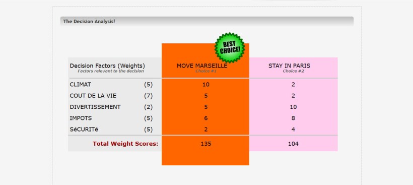 Pondérez l’importance de chaque facteur de décision en leur mettant un coefficient de 1 à 10. Le nombre 10 étant le plus important. Par exemple si vous souffrez du climat froid de Paris et que vous souhaitez changer de région, mettez un 10 dans le facteur climat car cela est très important pour vous. A l’inverse vous ne vous souciez pas vraiment des divertissements de chaque ville, cela n’a pas beaucoup d’importance pour vous, mettez un 2…