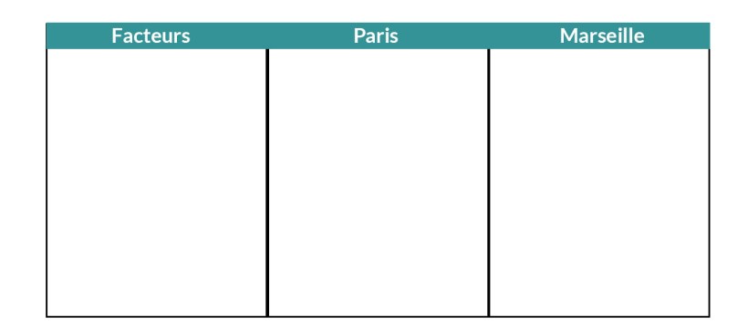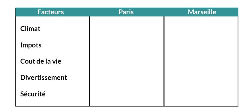 Exemple : imaginez que vous habitez à Paris et que vous souhaitez déménager à Marseille. Vous avez alors deux alternatives possibles, je reste à Paris ou je pars à Marseille. Imaginons que vous avez du mal à vous décider car vous n’y voyez pas très clair. Un jour, vous êtes prêt à partir à Marseille, le lendemain vous souhaitez rester à Paris. Ainsi il est l’heure de construire la Matrice de Décision Multicritères Pondérée (MDMP). Pour cela faites un tableau, et 3 colonnes.