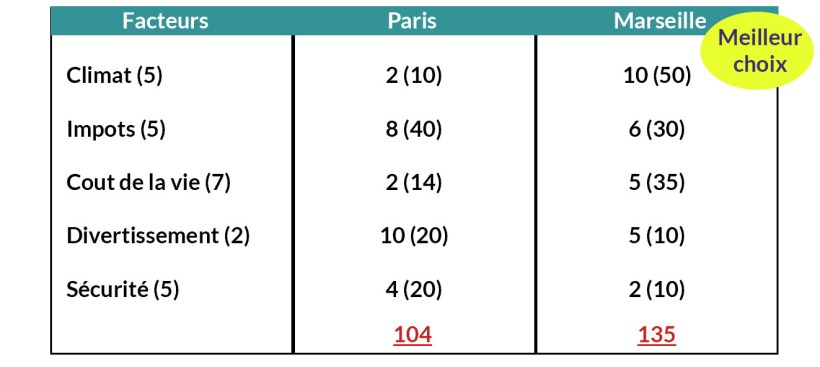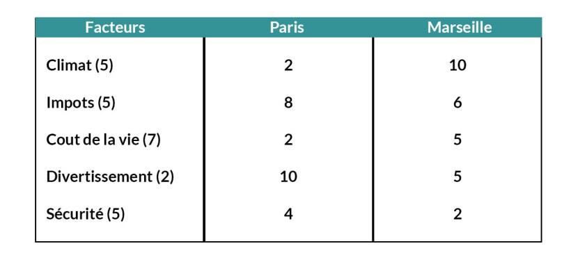 Après avoir donné un coefficient à chaque critère, attribuez une note à chacun de vos choix pour chaque facteur de décision. Le coût de la vie à Paris ? Vous jugez qu’il vaut un 2 alors qu’à Marseille vous estimez que les loyers sont moins chers, vous lui donnez 5 …