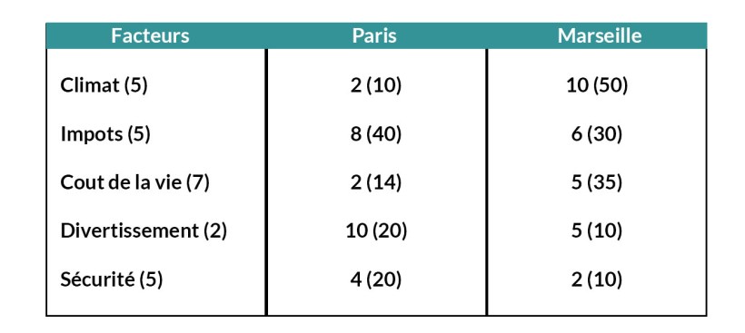 Ensuite pour chaque ligne, multipliez le coefficient par la note et mettez le résultat entre parenthèses à côté. Par exemple côté climat à Marseille 5*10=(50) et Paris 2*5=(10) ainsi de suite pour chaque facteur de chacune des deux villes.